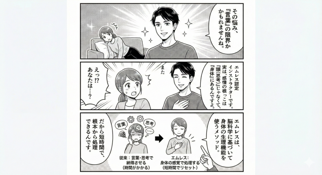 私たちが提案する「エムレス(EmRes)」は、従来のカウンセリングやセラピーとは全く異なるアプローチをとります。