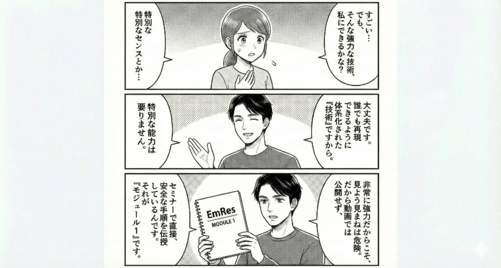エムレスは「魔法」や「特殊な能力」ではありません。脳科学に基づいた、誰もが習得可能な「技術」です。 だからこそ、見よう見まねではなく、安全な環境で正しい手順を学ぶ必要があります。