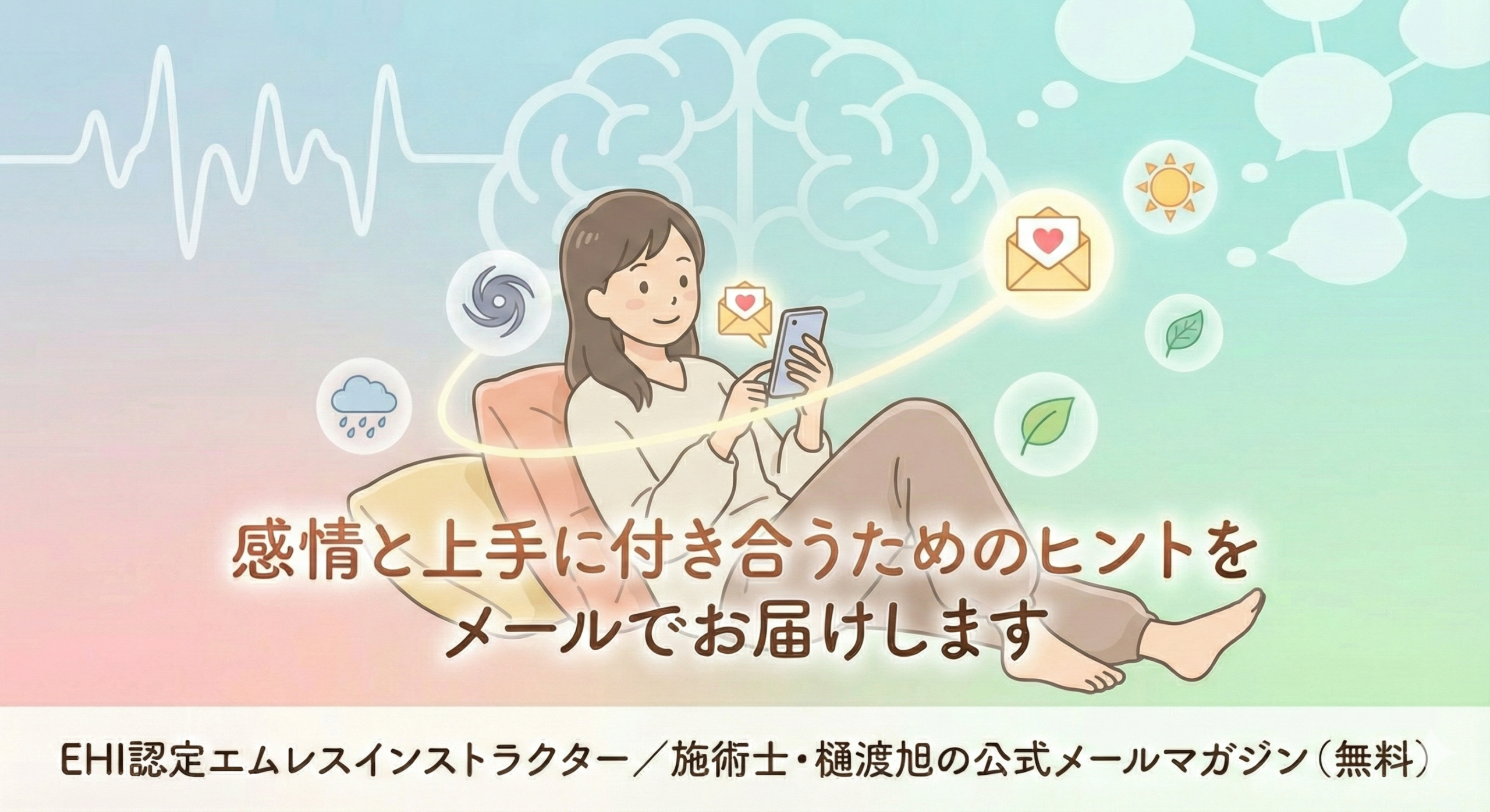 このメールマガジンでは、300名以上の感情の悩みに向き合ってきたEHI認定エムレスインストラクター/エムレス施術士・樋渡旭が、感情のメカニズムや脳科学の視点から、感情に振り回されないための考え方や知識をお届けします。
